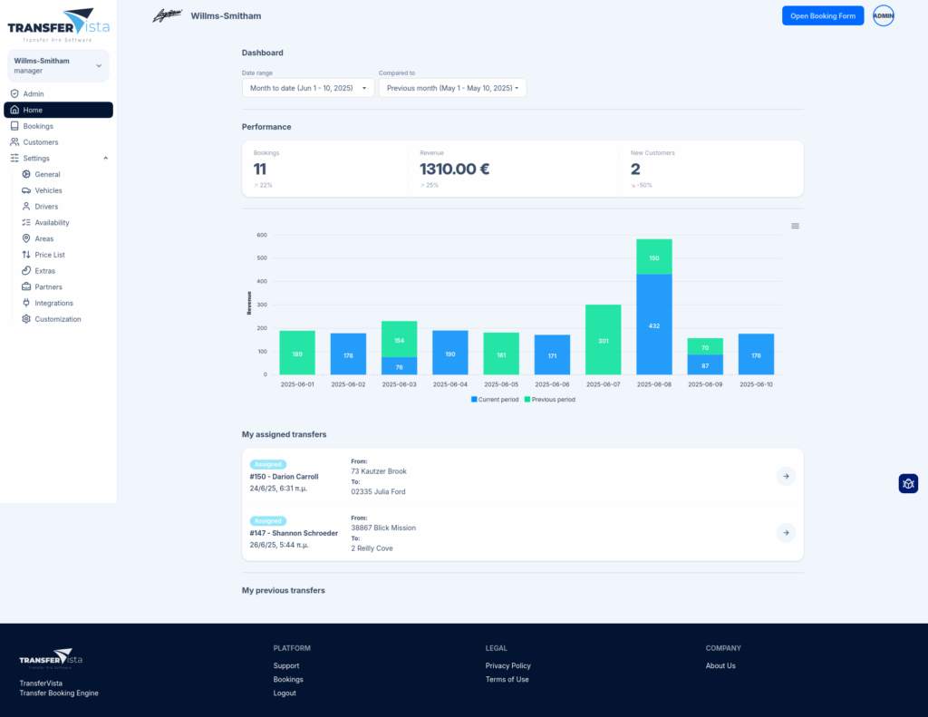 TransferVista gives you the tools to simplify your daily operations — from online bookings to automated schedules and payments — all under one dashboard. You’re always one step ahead. Use AI to automate your processes and dispatch your transfers