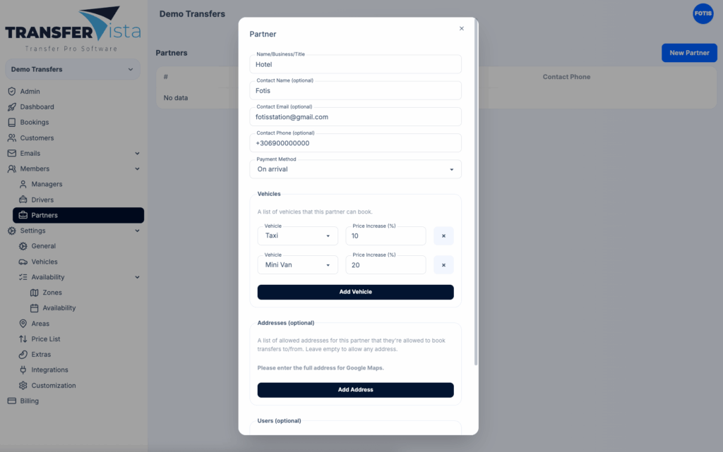 Absolutely. You can add a hotel, an office, or any other partner you have to your management. When you register them, you will copy the URL of the form that will automatically appear and send it to your partner so that they can fill out their own booking form. This way, you will have all their reservations in your management system and you will know how many reservations and how much money your partner has given you. The same applies to your partner; they will have their management system to see the reservations they have made for you.